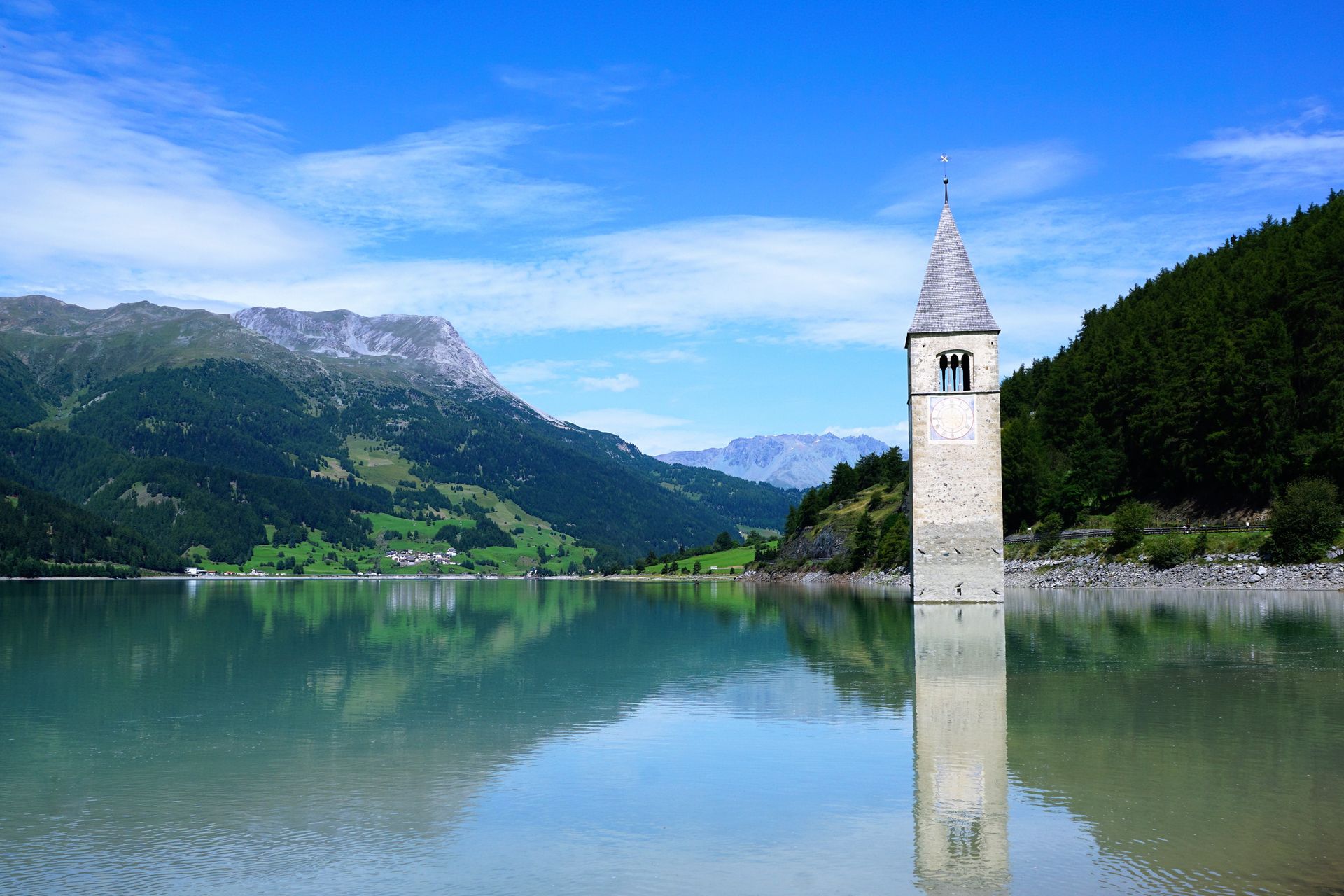 Val Venosta, in Alto Adige, a pochi chilometri dal confine con l’Austria, si trova il famoso Lago di Resia, il più grande della regione,